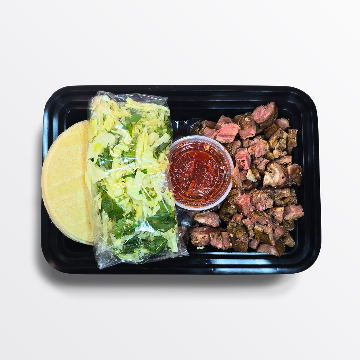 Carne Asada, Corn Tortilla, Cabbage Slaw, and Salsa Verde.