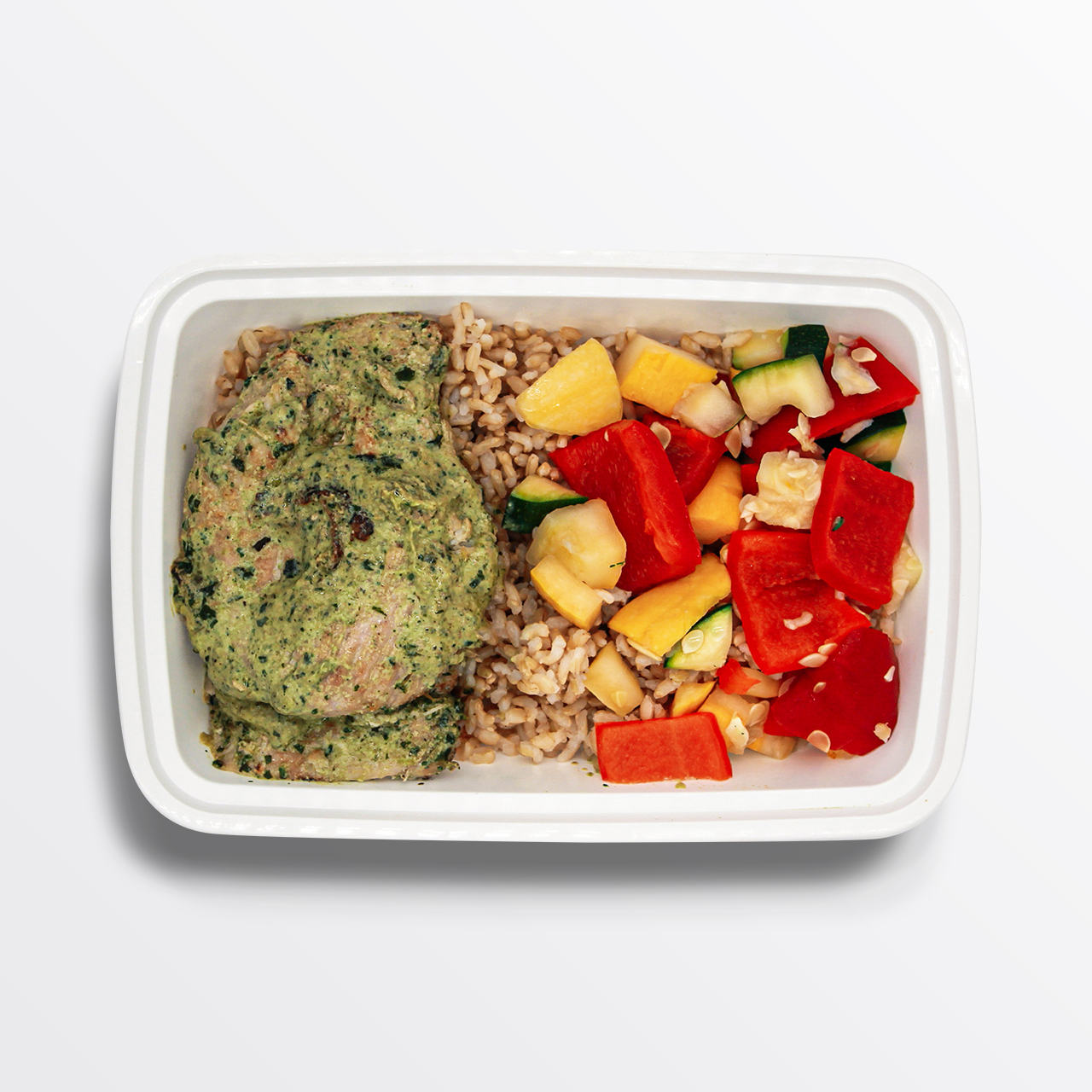 Sesame Ginger Chicken, Cilantro Lime Cauliflower Rice, Bell Peppers & Yellow Squash, Almond, Green Onion, and Sesame Oil.