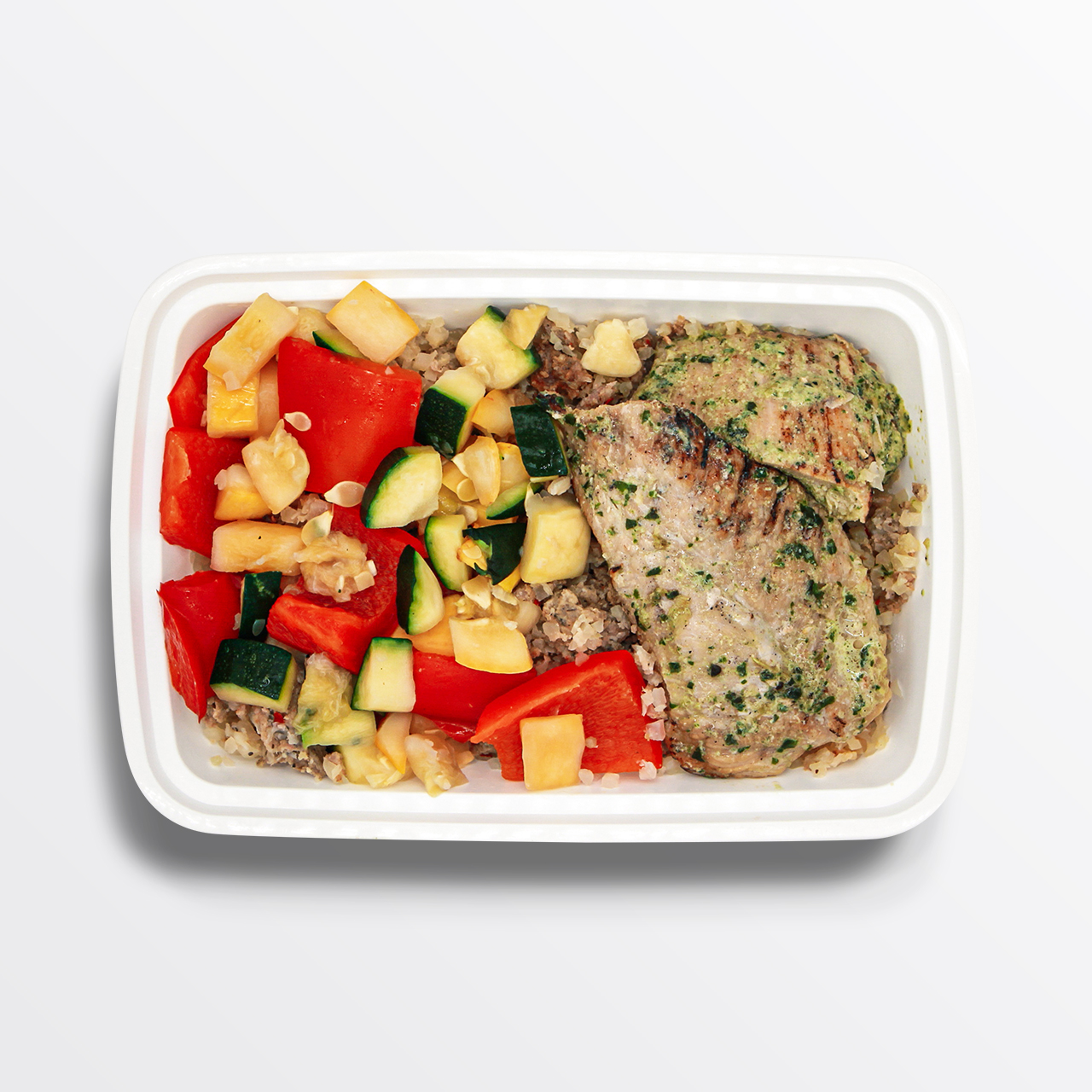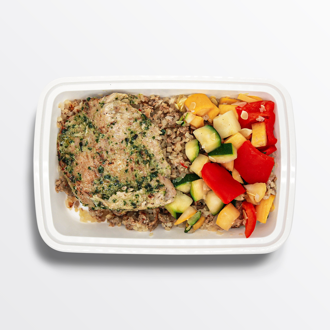 Herb Chicken, Cauliflower "Dirty" Rice, Vegetable Medley, Extra Virgin Olive Oil, and Pork Sausage.